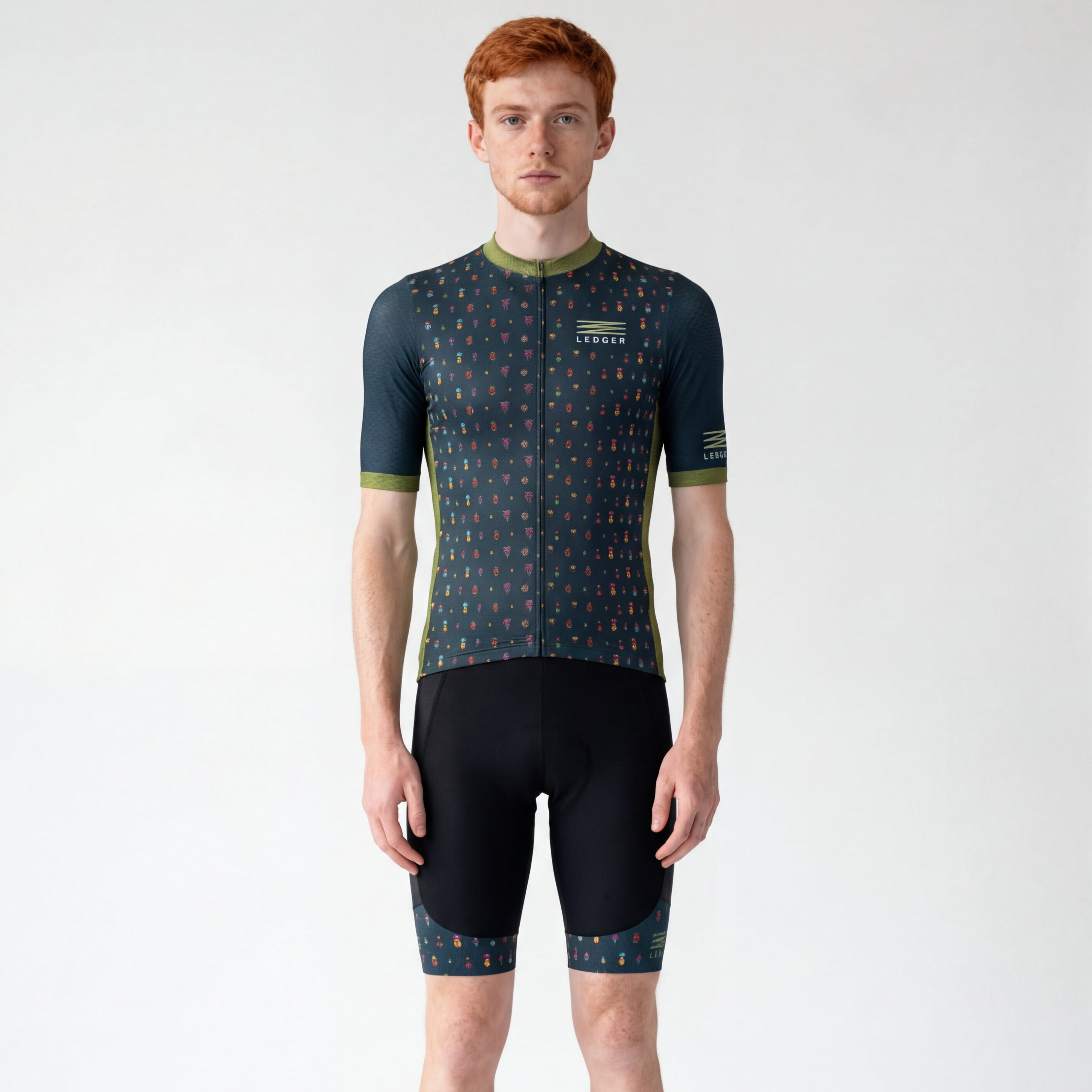 The Ledger Green design features graphics that are sublimated from top to bottom for a cohesive one-piece look that stands out in your cycling kit while maintaining technical performance.