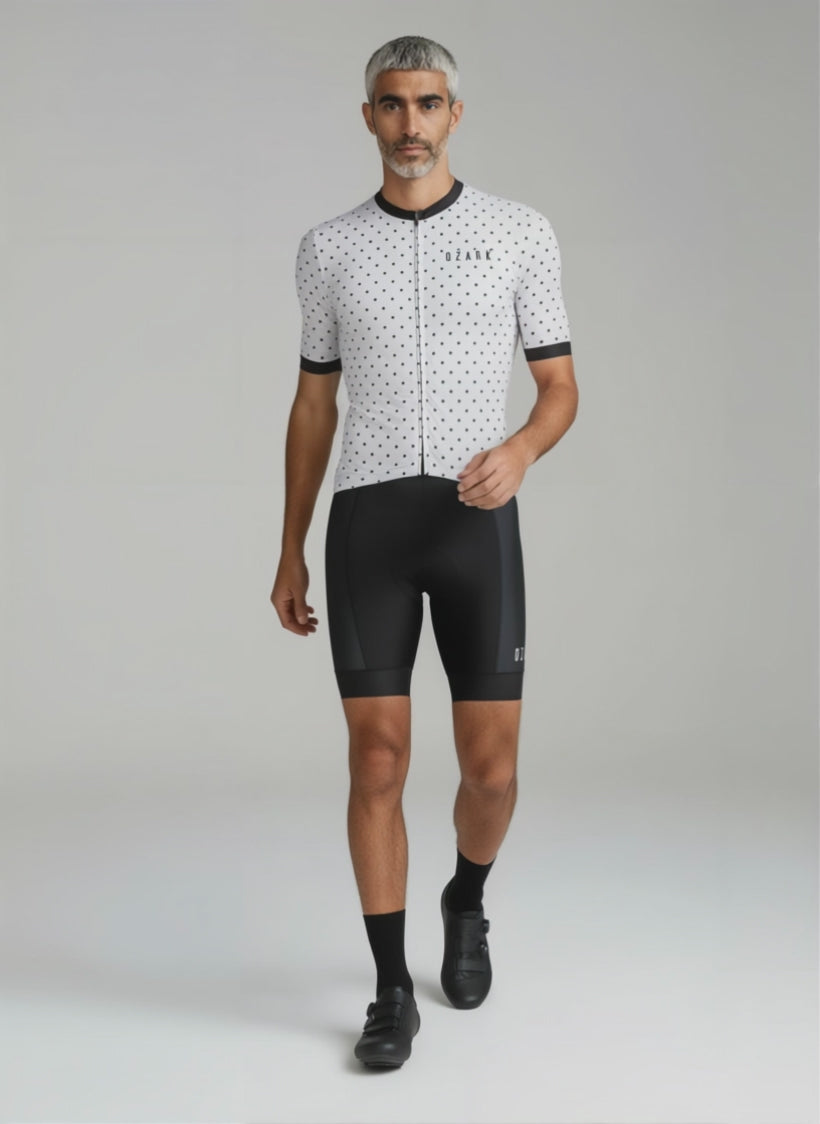 The Ozark Cycling Men’s Road / Gravel Jersey – White Polka Dot offers a balanced blend of performance, comfort, and functional storage, wrapped in a standout design that adds personality to your road cycling kit.